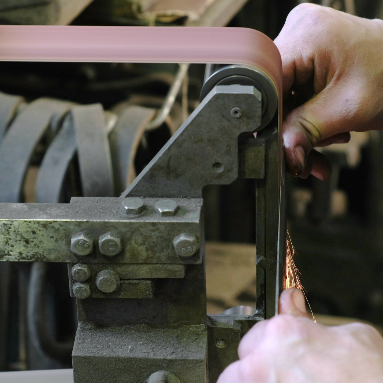 Knife grinding involves shaping and refining the blade's edge and profile through precision grinding techniques, enhancing sharpness and functionality.