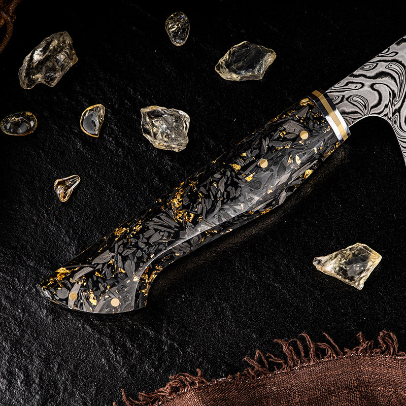 The blade is carefully made by combining VG10 and 15n20 steel through layering, welding, and hammering. This process gives each blade its own unique design, like a fingerprint. Each knife is a one-of-a-kind work of art.