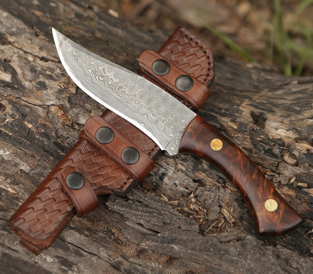 Virtue Damascus Hunting Knife Fixed Blade with Exotic Rose Wood Handle