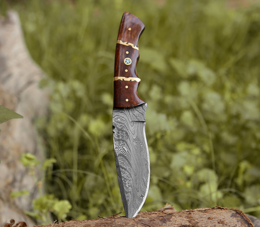 DAMASCUS STEEL HUNTING KNIFE, 9", DAMASCUS STEEL CLIP POINT BLADE, EXOTIC ROSE WOOD & BRASS HANDLE, FIXED BLADE, FULL TANG, HAND STITCHED LEATHER SHEATH