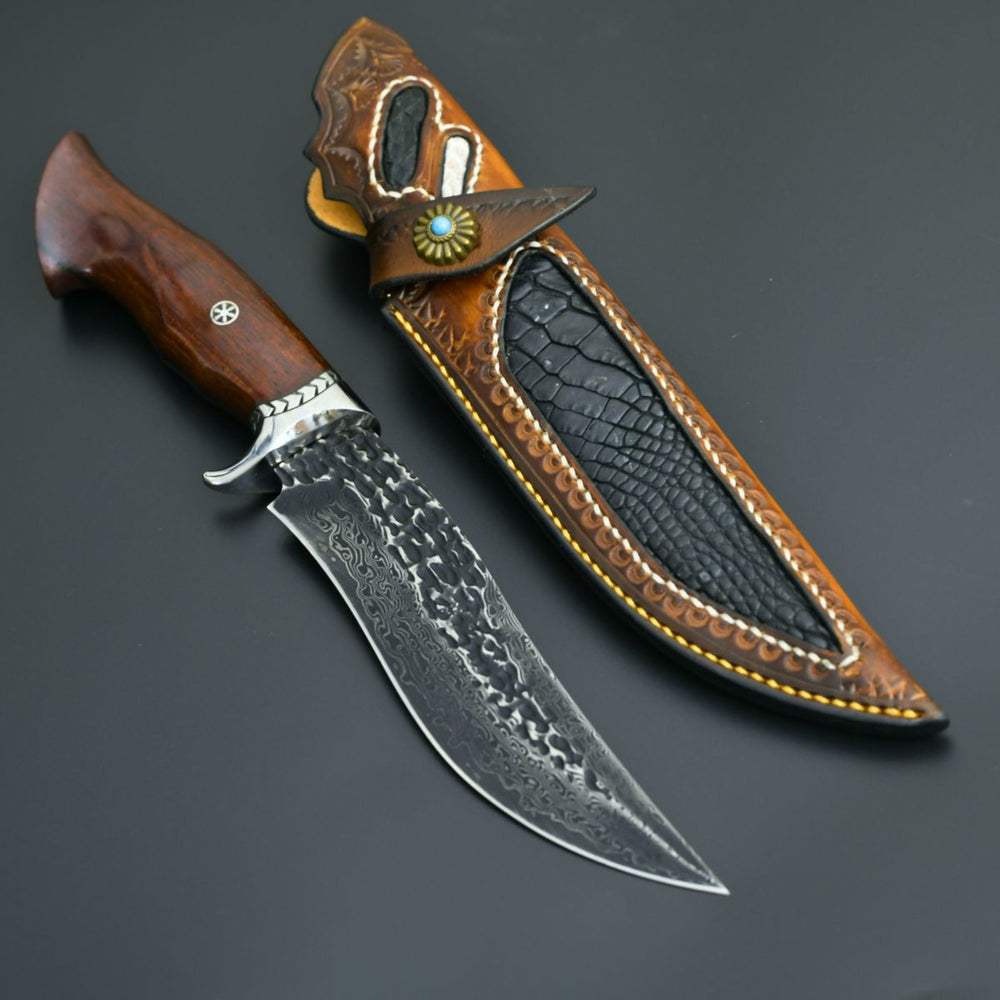 Aphrodite Handmade Japanese Hunting Knife, 10.5” Overall, Trailing Point Blade, Rare Exotic Sandal Wood Handle, Fixed Blade, Full Tang, Hand Stitched Leather Sheath, Pro Knife Sharpening & Personalized