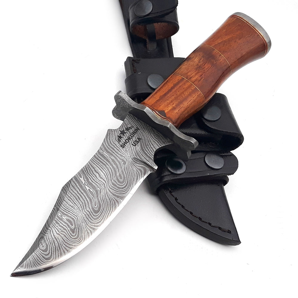 Damascus Knife - Hornet Custom Damascus Hunting Knife with Exotic Rose Wood Handle & Sheath - Shokunin USA