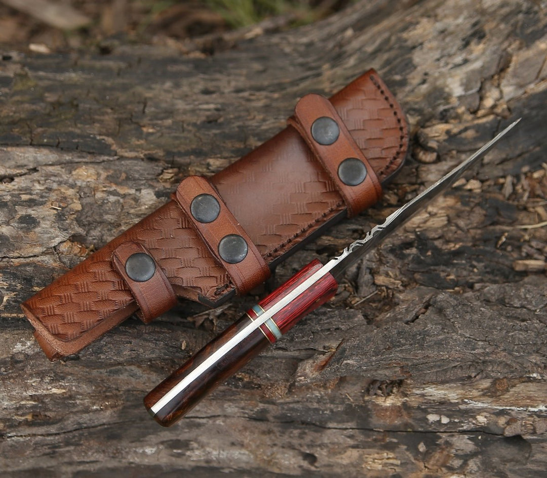 The included hand-stitched leather sheath adds both style and protection to this remarkable knife. Designed to securely hold the knife while providing easy access, the sheath embodies the craftsmanship and attention to detail that defines this exceptional gift.